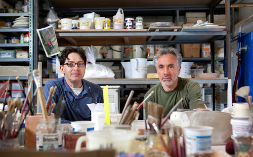 Bertozzi & Casoni was founded in 1980 in Imola by Giampaolo Bertozzi (born in Borgo Tossignano, Bologna, in 1957) and Stefano Dal Monte Casoni (born in Lugo di Romagna, Ravenna, in 1961). From their early studies at the Ceramic Art Institute of Faenza their interests gravitated towards a dialogue with the great traditions in art and they nurtured an original vocation for experimenting with sculpture, seeing in ceramics the possibility of painted sculpture. Bertozzi & Casoni went on to attend the Academy of Fine Arts in Bologna, and participated in exhibitions that focused more on the artists and the motivations for a “new ceramics” in an effort to bridge the gap in support of an expressive medium viewed as a minor art with respect to other artistic forms. Their first creations were small and made of thin polychrome majolica. From 1985 to 1989 they collaborated with the Cooperativa Ceramica d’Imola as researchers in the Centro Sperimentazioni e Ricerche sulla Ceramica (19871988), an experience that led to the association with “K International Ceramics Magazine” for which they would also create cover images. As the relationship with the Cooperativa was nearing its end, they produced two major pieces sponsored by the company: the projects in Tama New Town (Tokyo 1989-90) and the large panel “Ditelo con i fiori” appearing on the exterior wall of the Imola Hospital. Between 1983 and 1994 they engaged with the world of design thanks to a special relationship with exhibition space Dilmos in Milan and participation in several editions of the Abitare il Tempo trade fair in Verona and the Trienniale of Milan, in addition to the exhibitions in the former church of San Carpoforo in Milan. They also designed the “Poltrona Ercolano” for Dino Gavina. During the 1990s their work took on a much more conceptual and radical aspect, almost to compensate for an exaggerated expressiveness and rigid perfection in execution that, nevertheless, at the end of the century with “Bosco sacro” of 1993, “Evergreen” of 1995 and “Scegli il Paradiso” of 1997, reached dimensional and creative heights not earlier achieved. With this latter work, Bertozzi & Casoni would close the chapter of painted majolica and move into experimentations characterised by an almost exclusive use of materials and technologies derived from industry. This was a decisive step that permitted their works to conquer a higher level of physical presence. The pictorial virtuosities were abandoned in favour of an objective rendering of selected subjects. The preferred iconographic themes, which found substance in the broad artistic themes vanitas and memento mori, underwent a fantastic transfiguration, and their formal reproduction took on an objective form that diminished the presence of the artists themselves and the conditioning perception of a particular time. This marked an important turning point, leading to a new chapter of “contemplations of the present” where in a sort of “epic of trash”, the attraction for what is fleeting, transitory, perishable and in decay, becomes an internationally recognised icon of a human condition that is not only contemporary. Their work now attracted the interest of art critics, museums and major Italian and international art galleries. Between compositional surrealism and formal hyperrealism, Bertozzi & Casoni have dedicated years to examining the refuses of contemporary society, including those cultural and artistic, characterised by a never-ending vivifying alternation between descents into decay and revivals of survivors, overlooked beauties, abstraction and representation, impermanence and eternity, history and contemporaneity, fantastic imagination and technical precision.