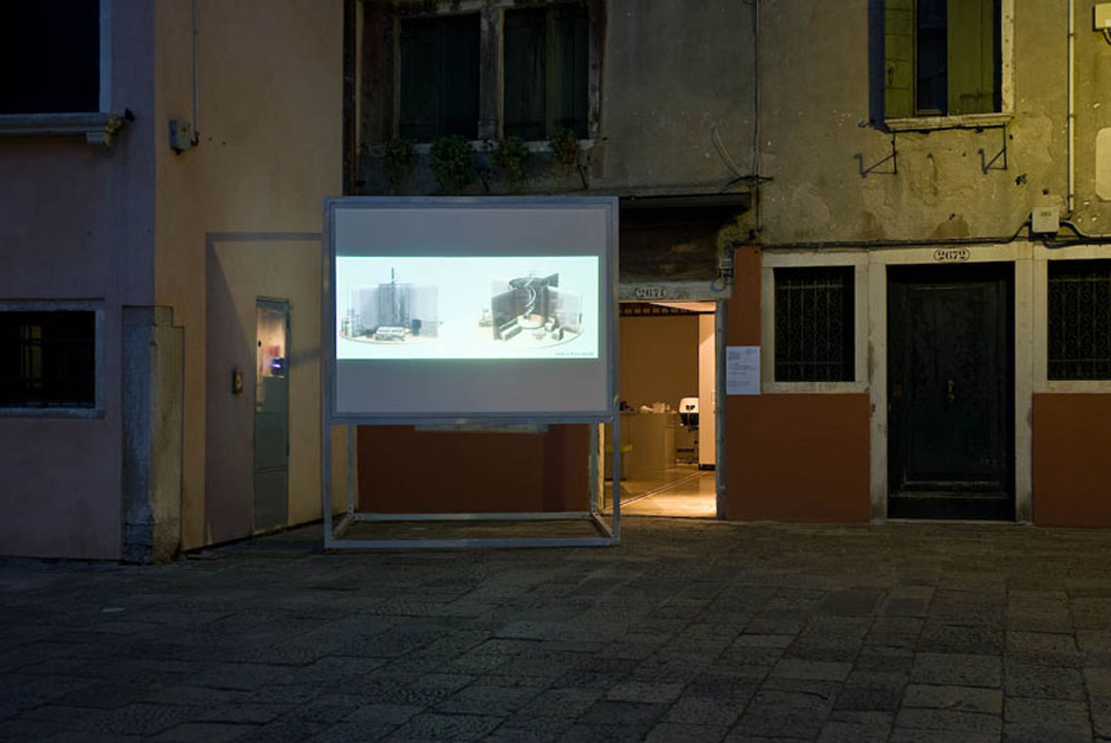HOME ON THE STREET are Designs for Living for low-cost urban housing for the at-home freelance-worker. Projected outside the exhibition space in Campo San Maurizio, the images present homes which rotate, fold, elevate and slide to provide maximum space for the necessities of daily life (live, sleep, eat, work).
