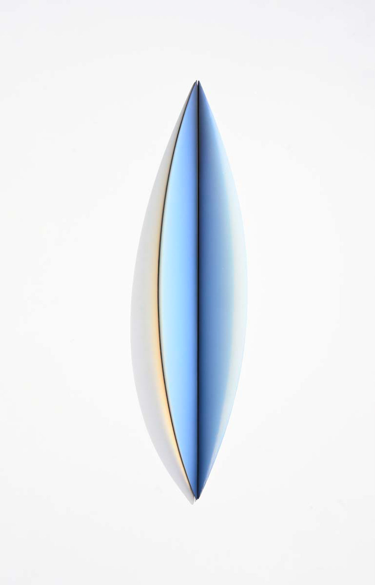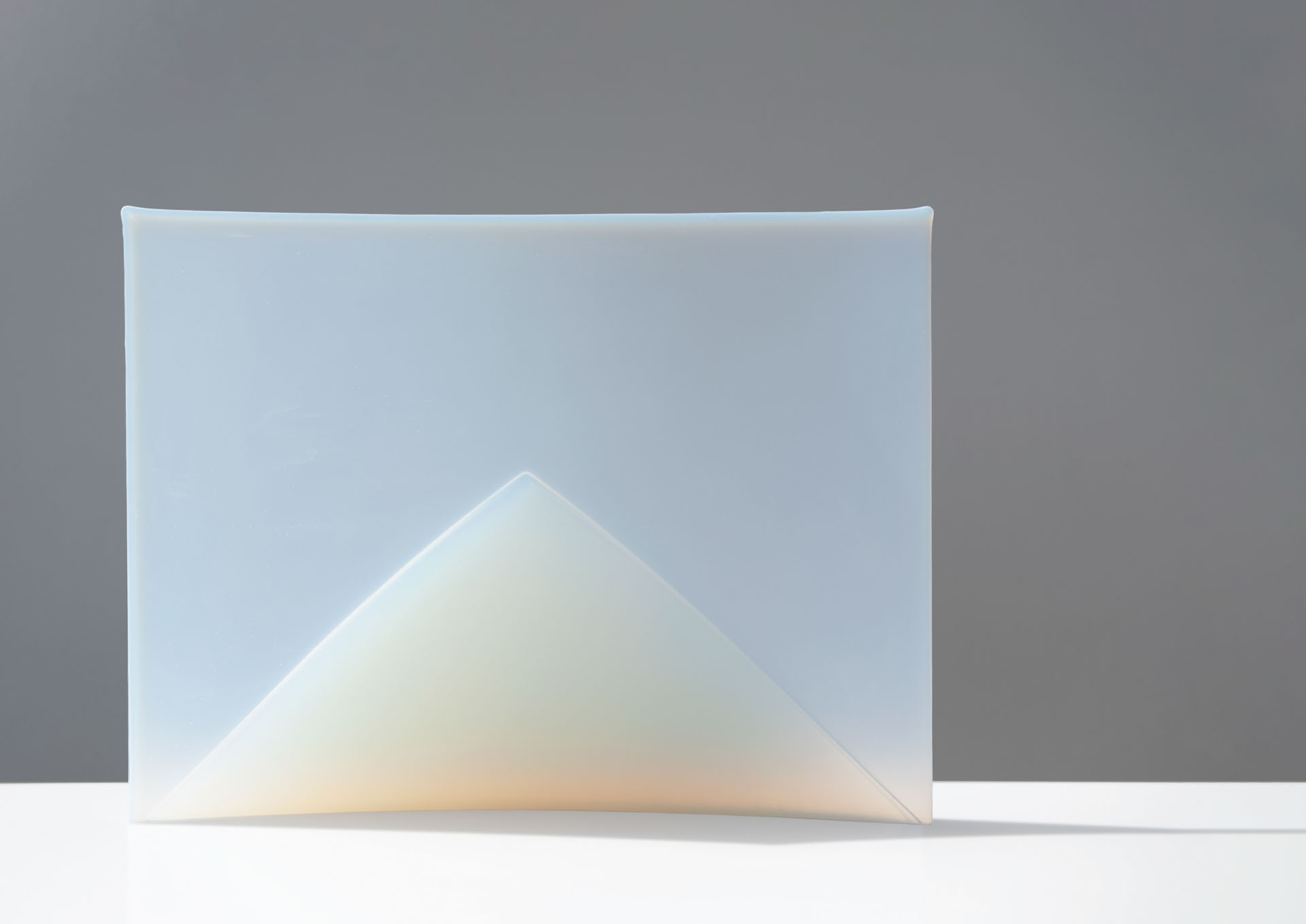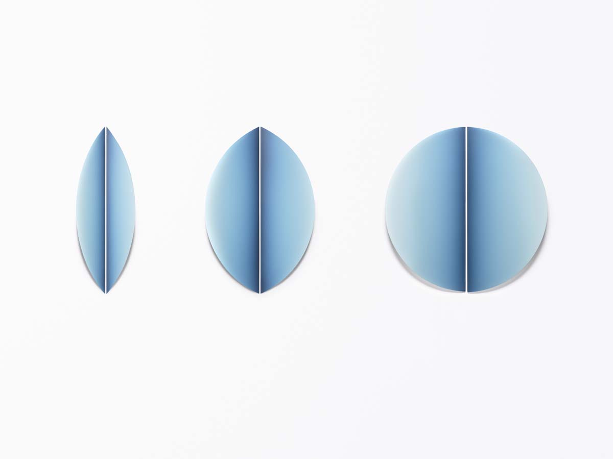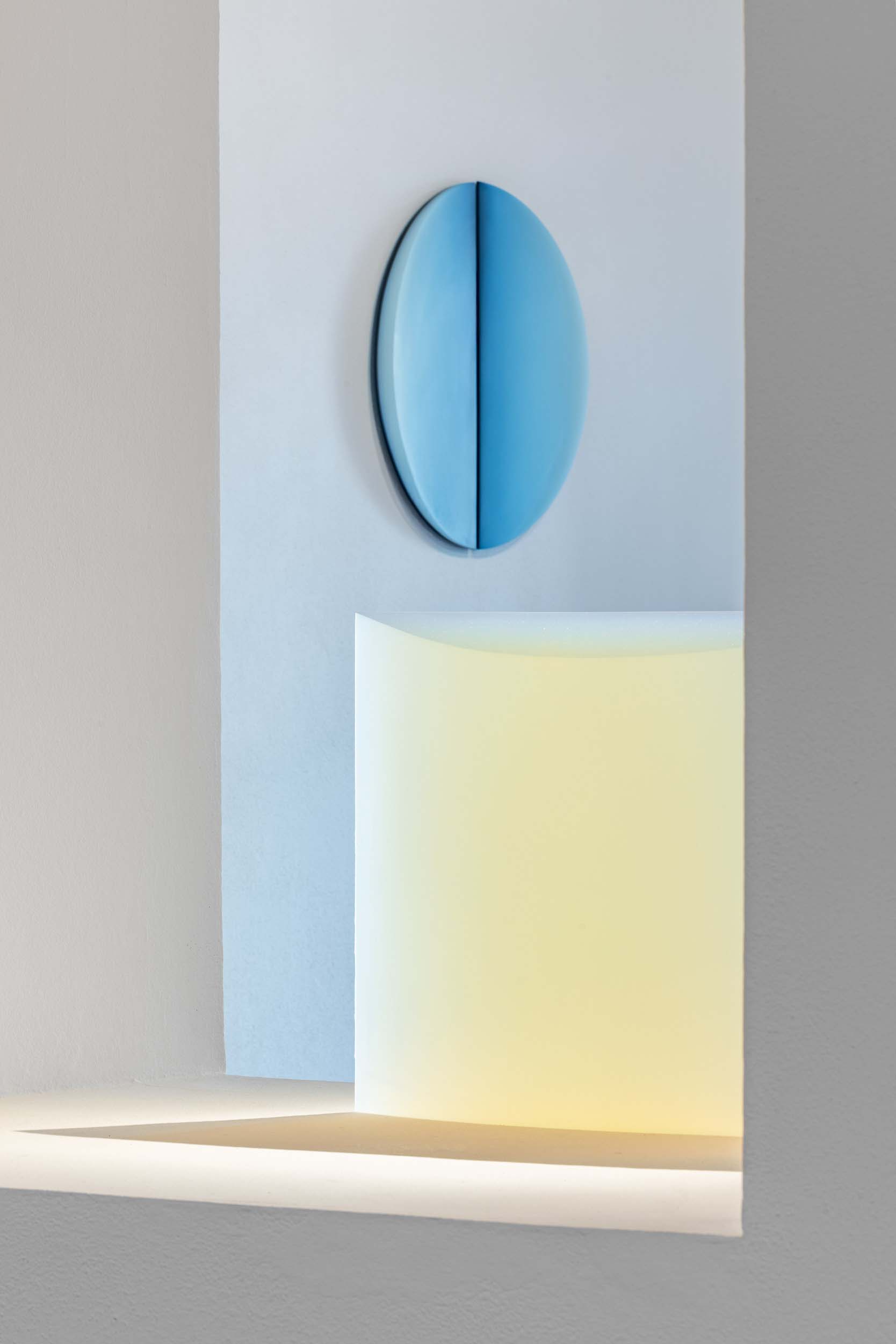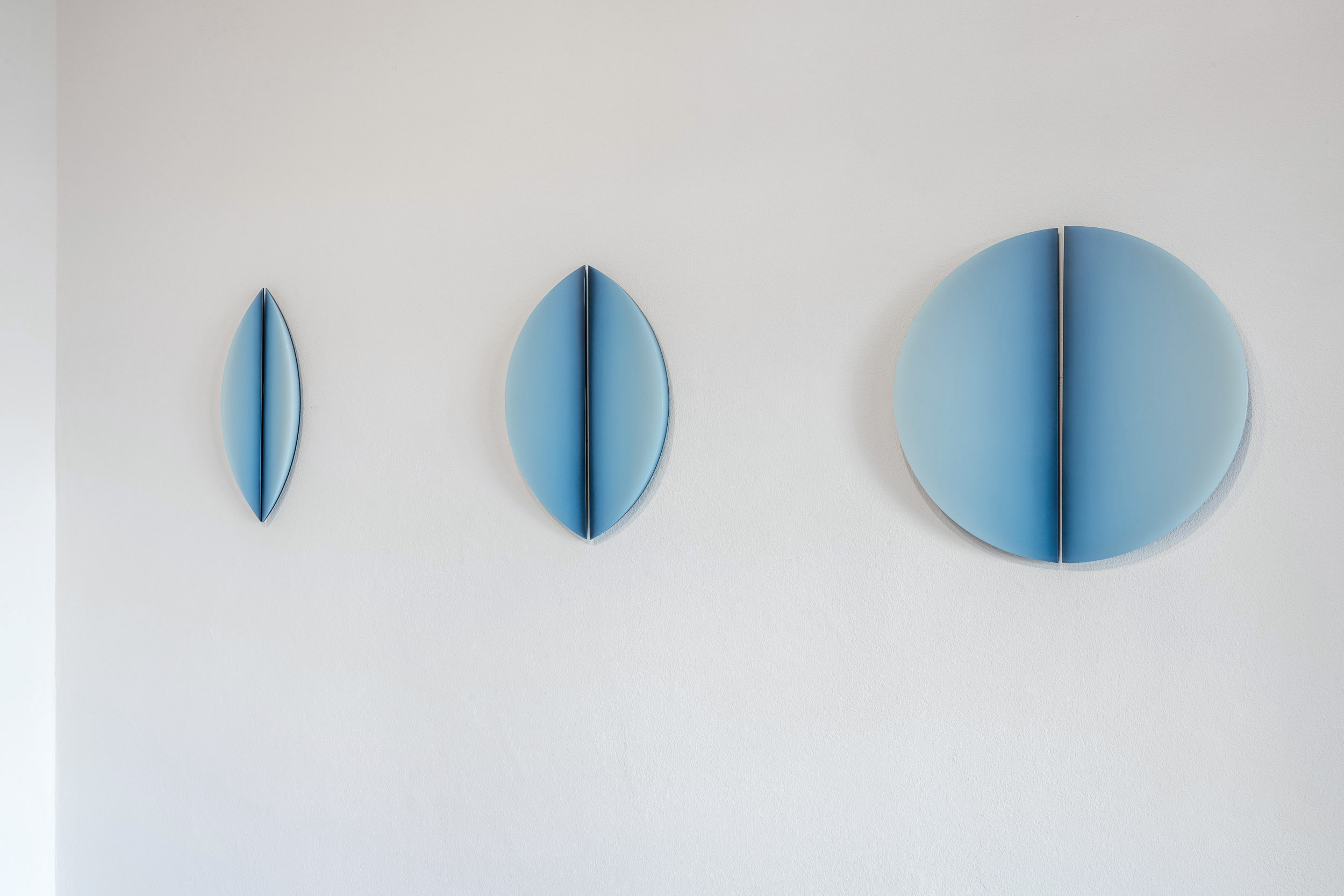 The pieces are made with an opaline glass that splits light into its spectrum of warm and cool tones. As light creates the blue color of the sky, it creates the blues in these pieces, tonally changing with the opacity of the glass. Under certain light conditions, however, a pink reflection can be seen, like a glimpse of the last light in a disappearing sunset.