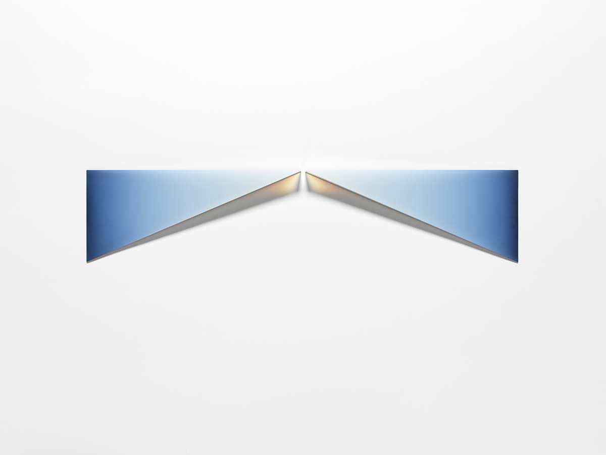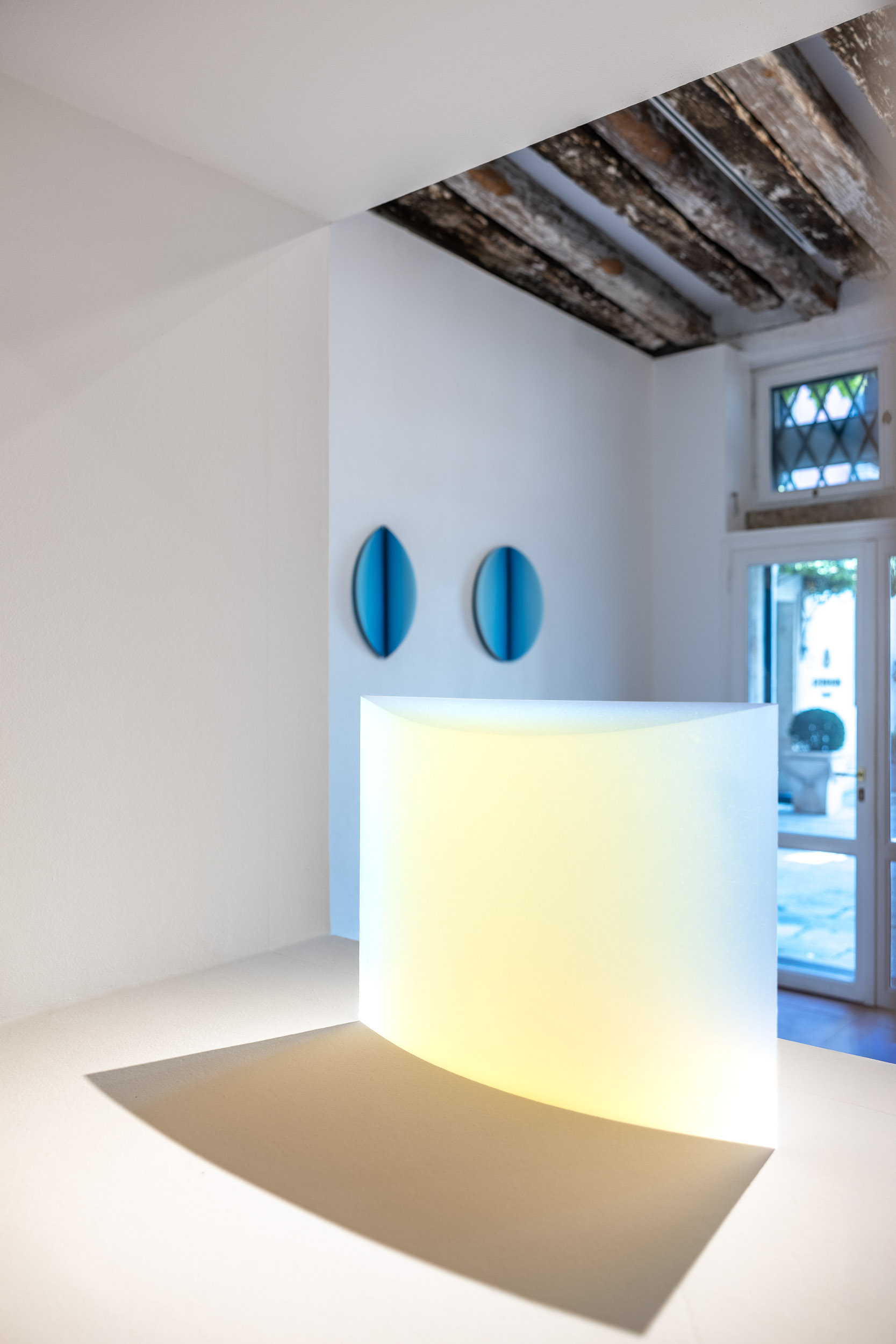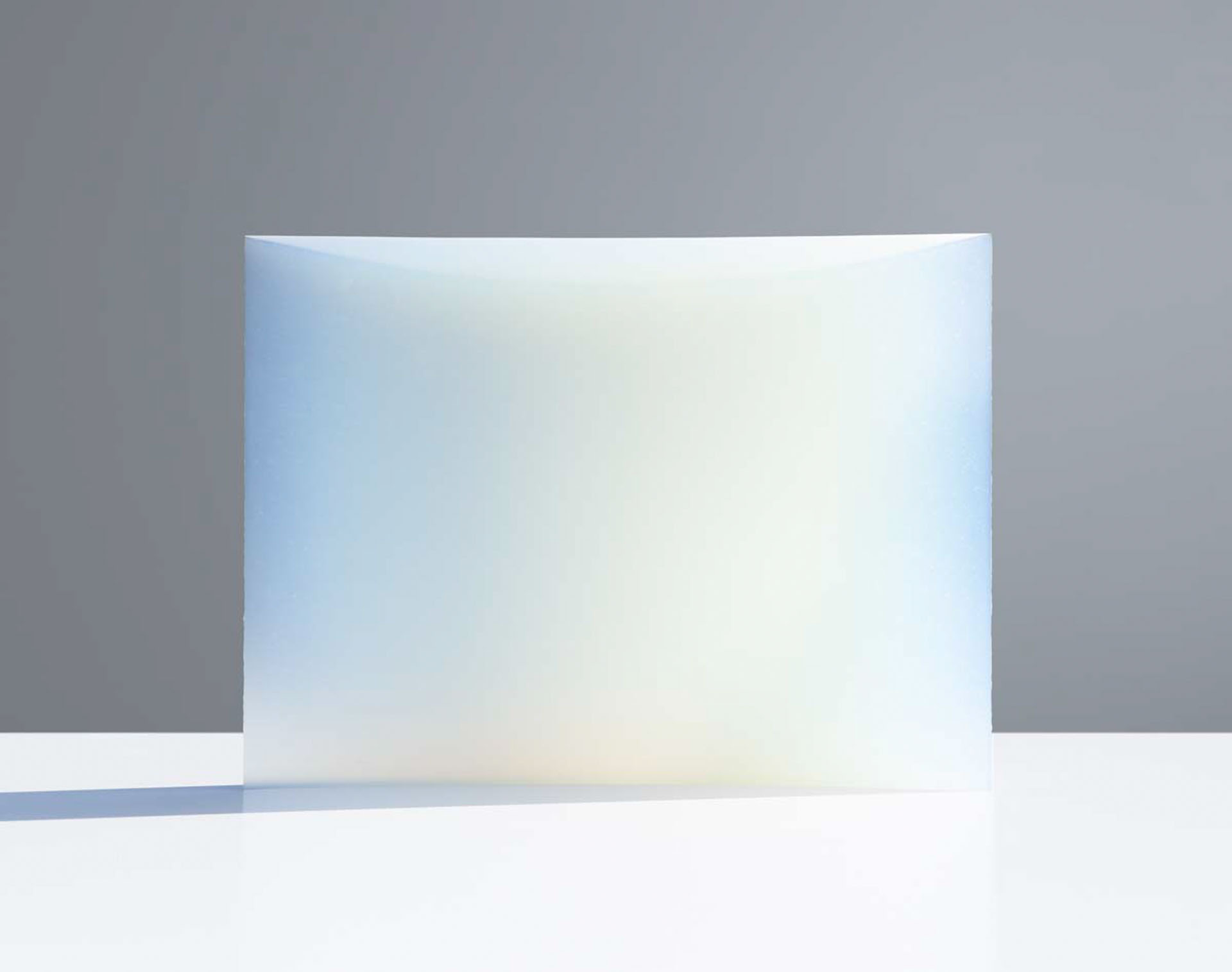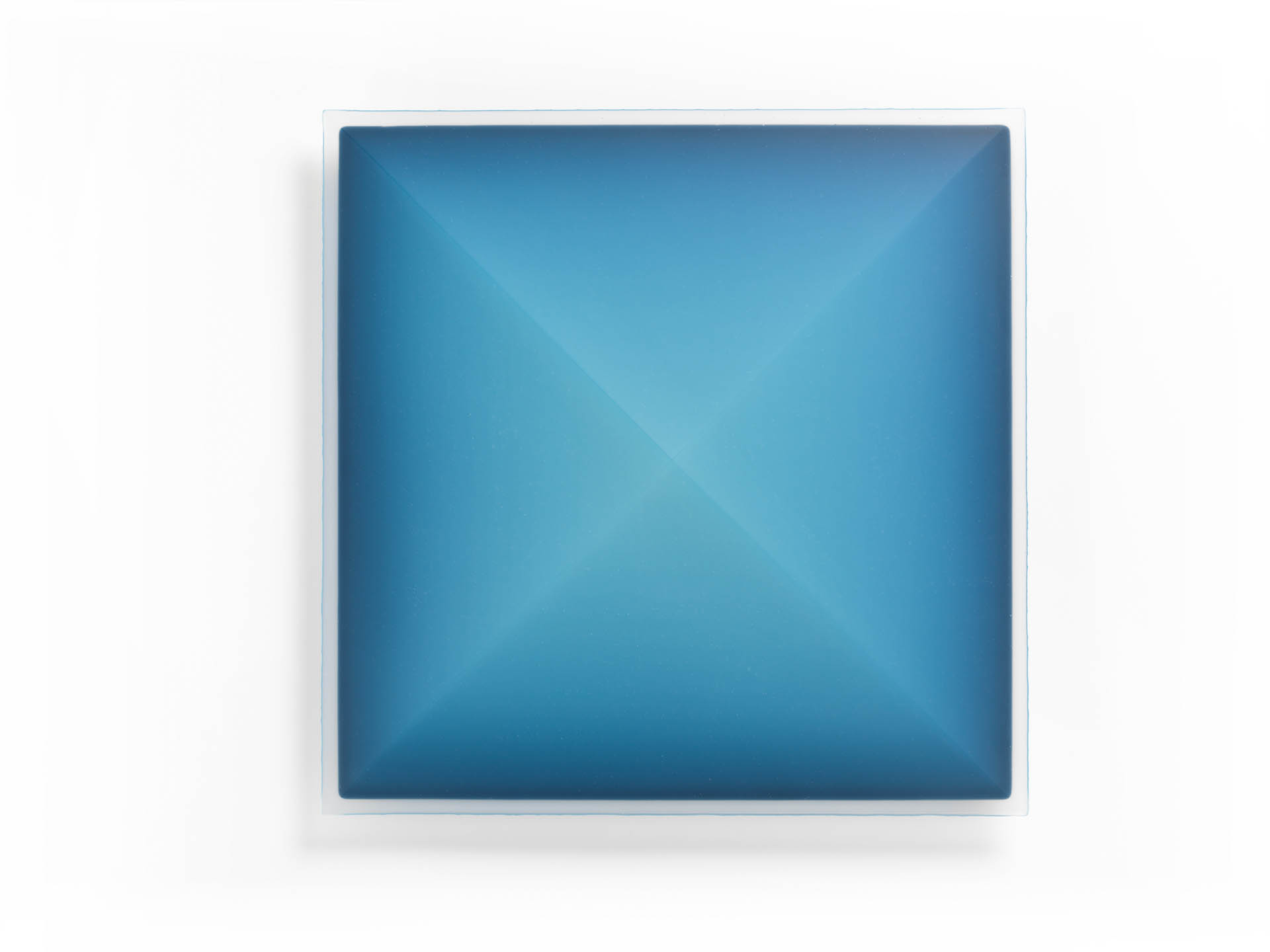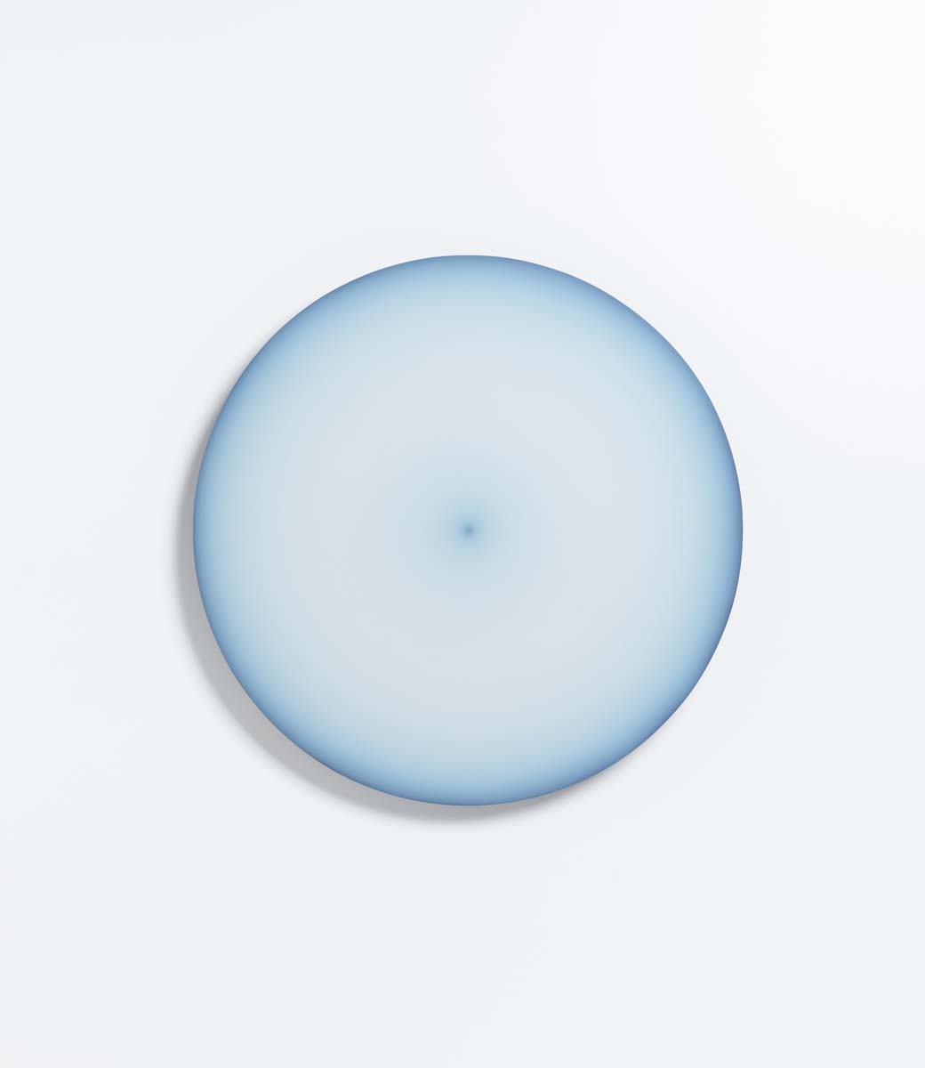 The pieces are made with an opaline glass that splits light into its spectrum of warm and cool tones. As light creates the blue color of the sky, it creates the blues in these pieces, tonally changing with the opacity of the glass. Under certain light conditions, however, a pink reflection can be seen, like a glimpse of the last light in a disappearing sunset.