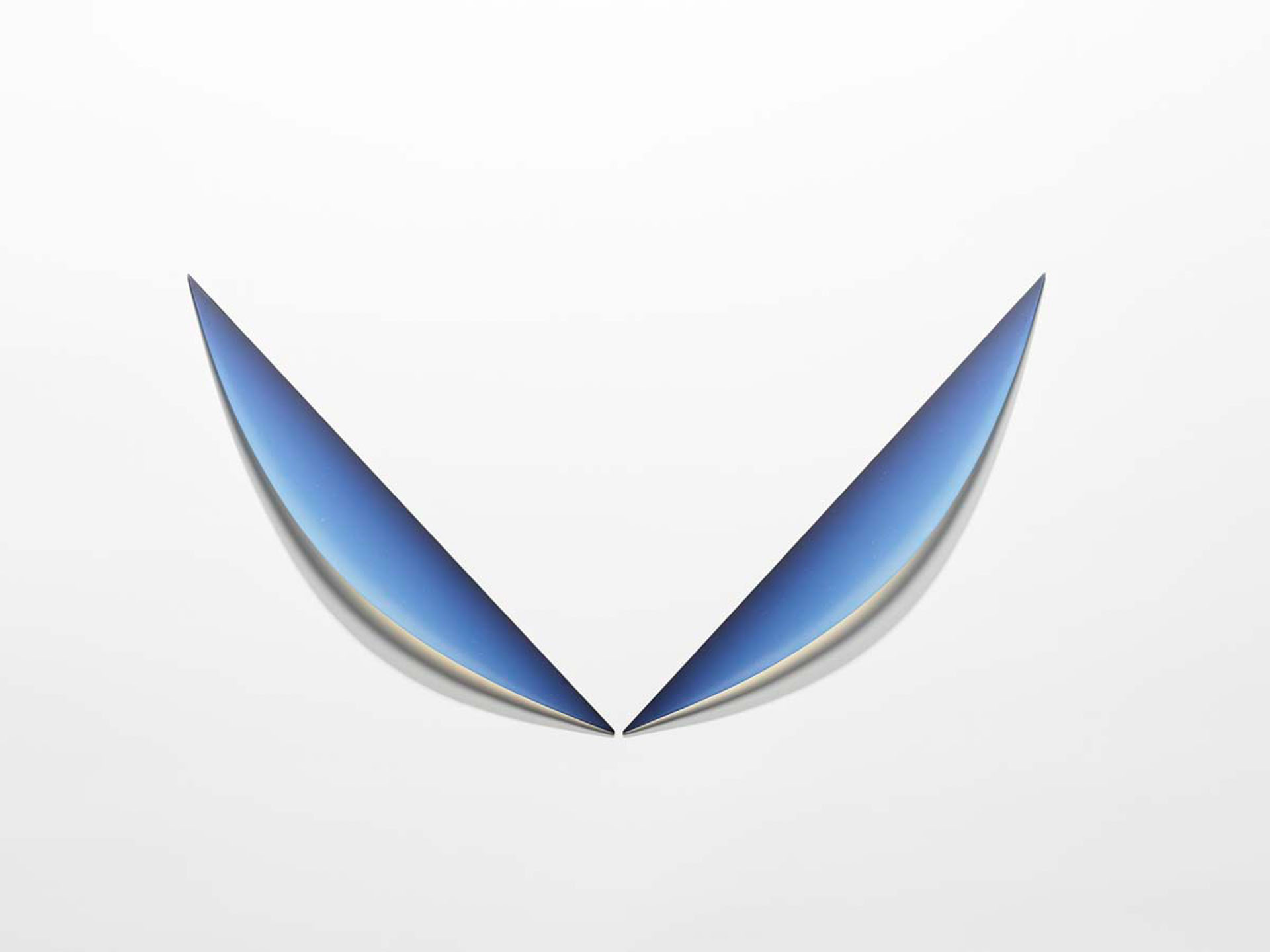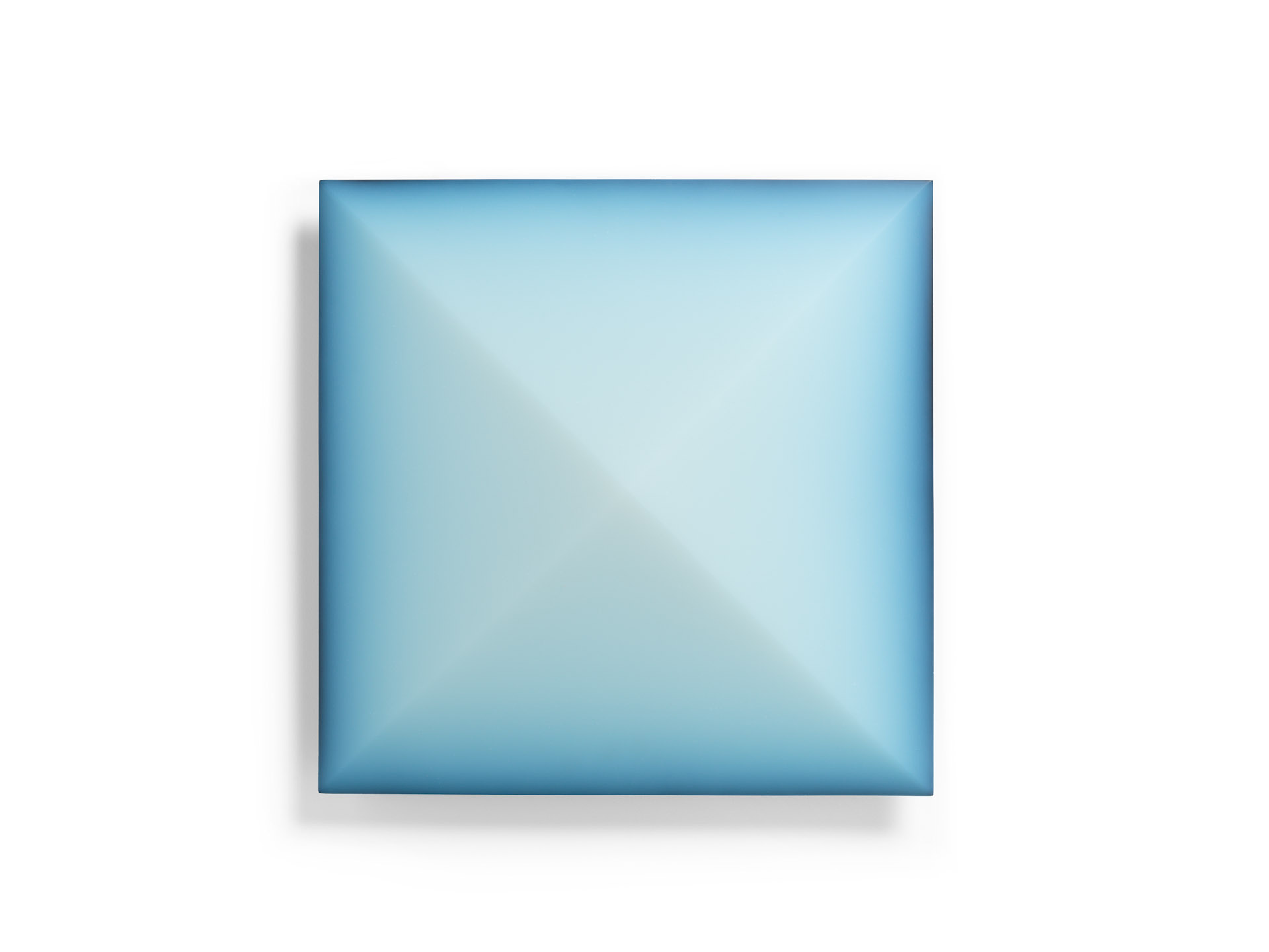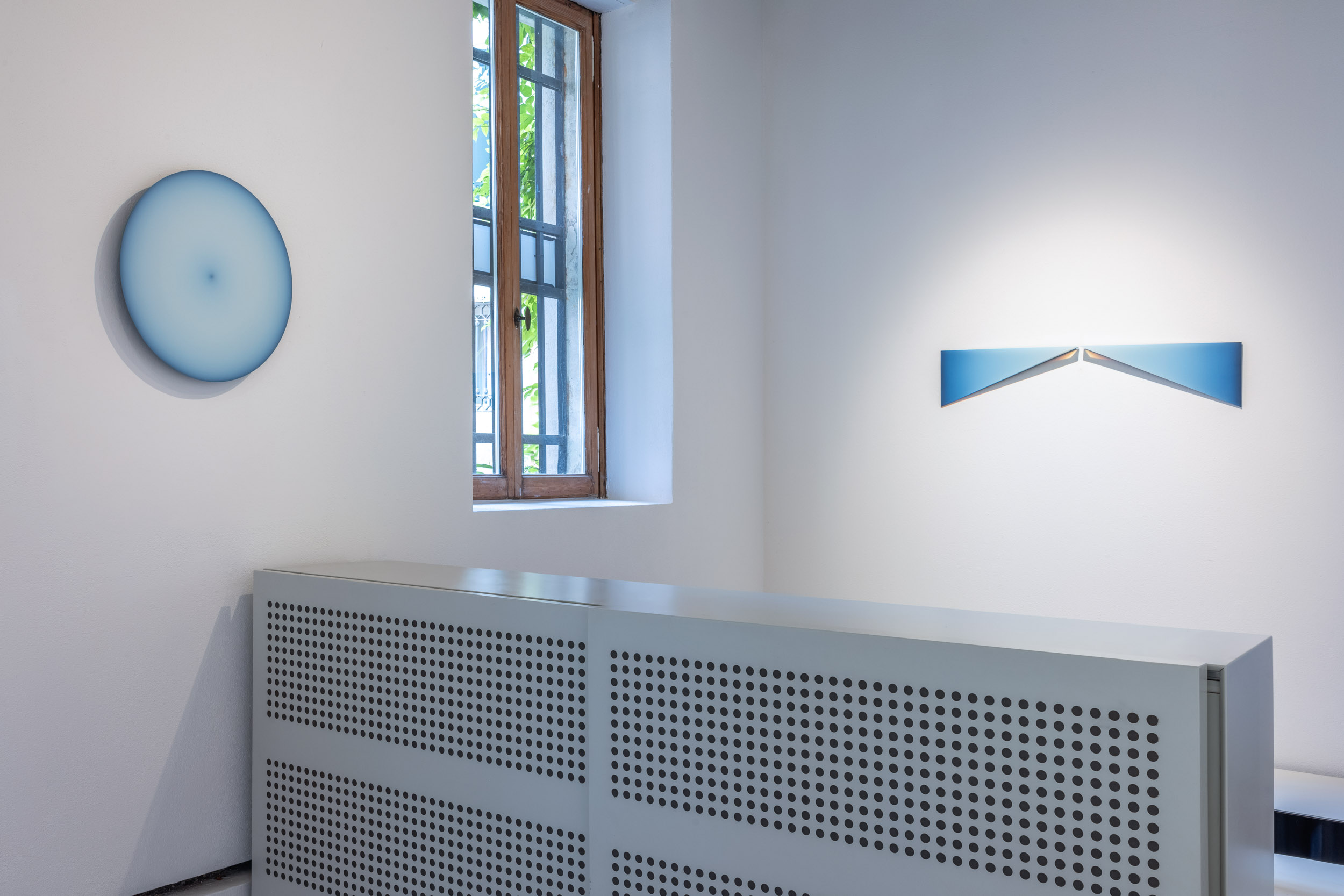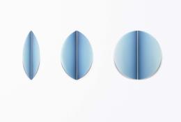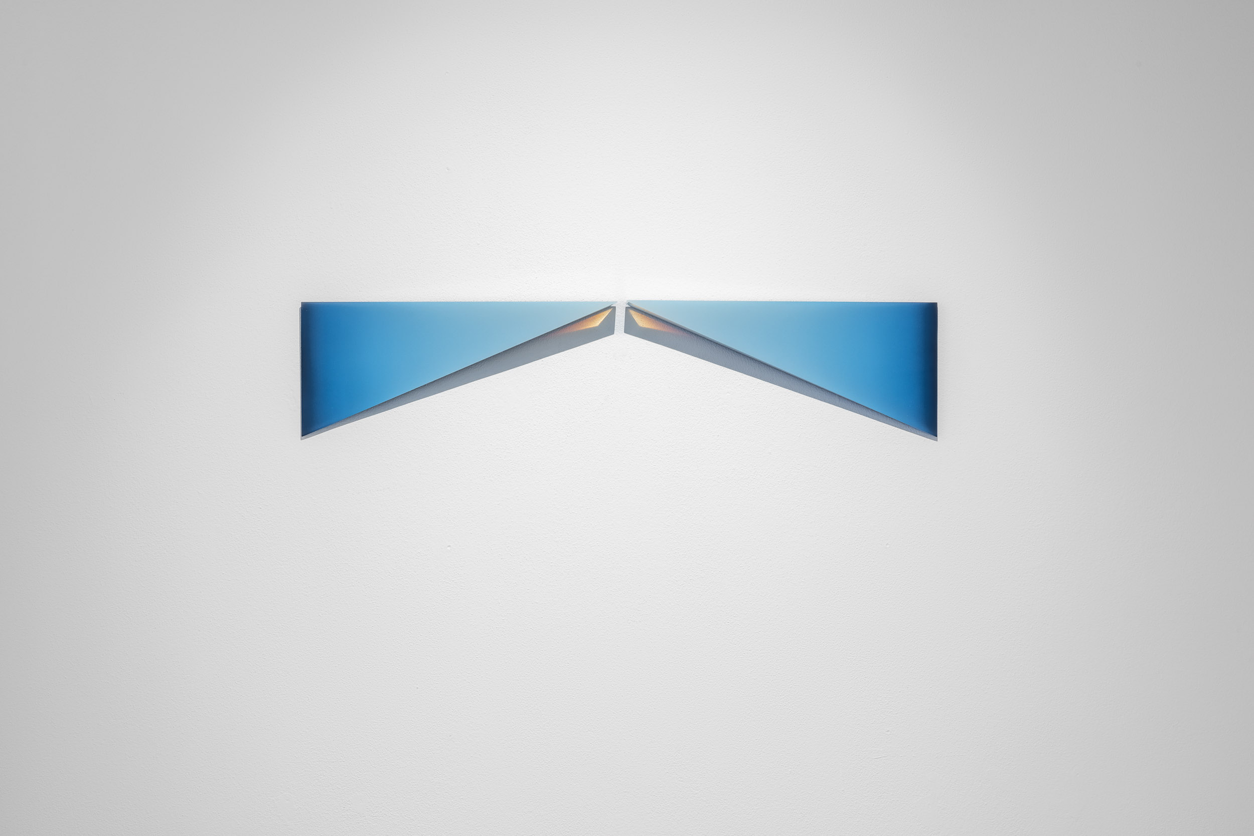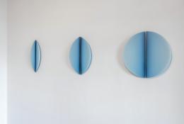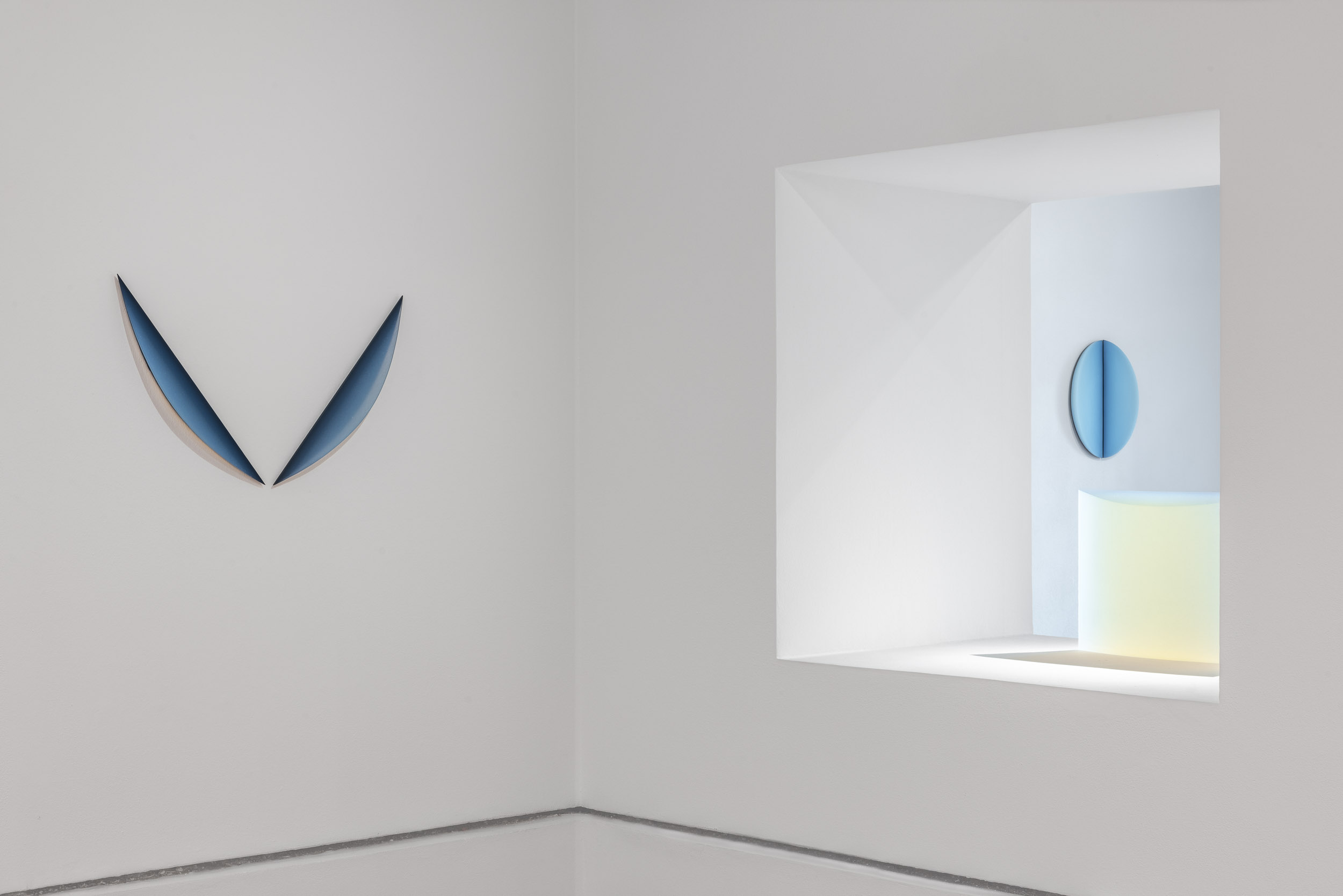 The pieces are made with an opaline glass that splits light into its spectrum of warm and cool tones. As light creates the blue color of the sky, it creates the blues in these pieces, tonally changing with the opacity of the glass. Under certain light conditions, however, a pink reflection can be seen, like a glimpse of the last light in a disappearing sunset.