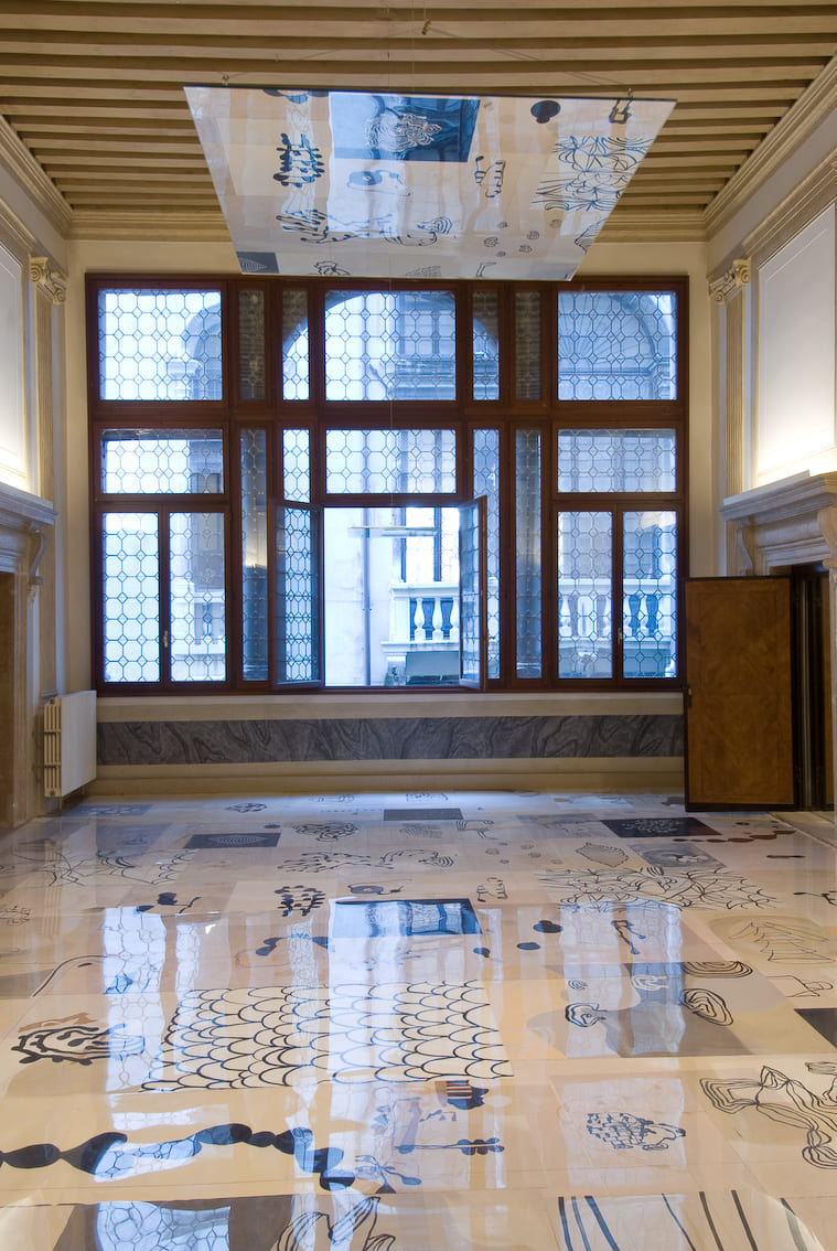 The artist intervenes almost in an architectonic way in an empty gallery, reinterpreting the emptiness, with a simplicity which is not banal, rather extra-ordinary. Palazzo da Ponte becomes a frame for this great work made up of more than three hundred drawings on paper, all side by side on this floor. The rooms of the gallery are transformed in one huge installation, in which the vertical edges of the walls become an architectonic frame which greets both the work and the public. Signs, subjects and glances from the public meet, generating an infinitive number of exchanges and identities. The drawings along the borders generate sets and new relations, unforeseeable, giving shape to further analogies in the images, which, at times one can define, and at others, are imprecise.