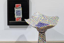 "Richard (Dick) Marquis, a towering figure in the American Studio Glass movement, has been invigorating the art world for fifty years with works embodying a rare combination of finesse, intellect, and whimsy. The sacred side of his work is expressed through his obsessive technique (see Lord’s Prayer murine), and deep respect for history (nods to venetian artist Carlo Scarpa). The profane side is expressed through his irreverent use of his skills (such as a bud vase formed of a four-letter expletive) and visual iconoclasm (cheap knickknacks combined with highly crafted objects).