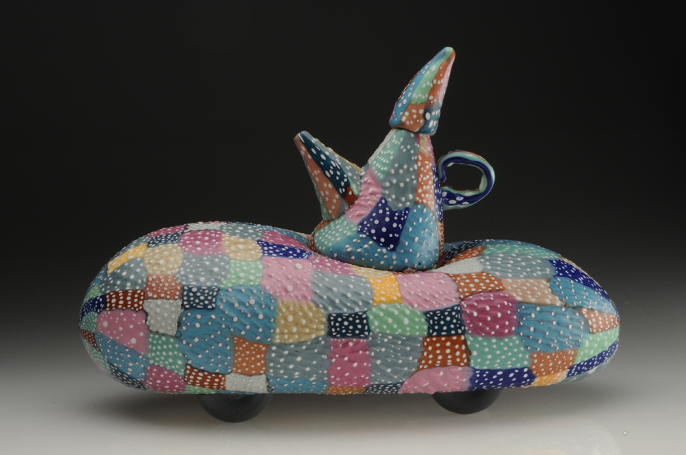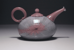For this show, Marquis is presenting different works made between 1990 and 2017, characteristic of diverse phases in his career. Teapots, inspired by the American Pot Tradition but made with the use of murrine, zanfirico and granulare techniques, and two early examples from 1990; the famous Marquiscarpas, using a complex murrine technique, and named in honour of the Venetian Architect Carlo Scarpa, famous designer for Venini during the 1940’s. In addition he is showing the colourful Cartoon Cars in granulare technique and a brand new work dedicated to Venice: Venezia Puzzle Fan with Teapots, a wall piece with glass and found objects, recalling the Venetian cityscape.