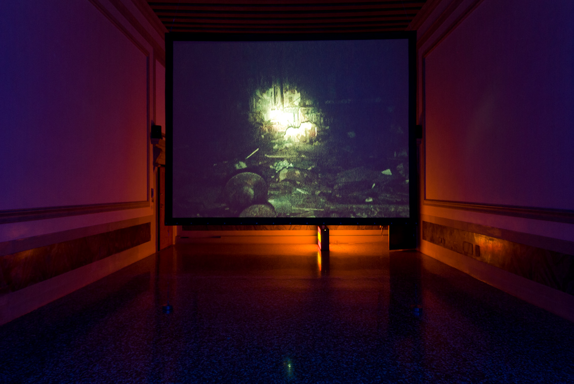 Unbuilding, ending on 21st November 2010, pursues in the gallery Caterina Tognon Arte Contemporanea the topic of the construction and the deconstruction of spaces, in both the literal and metaphorical sense. Among the exhibited works the video Counter-poison is the transcription of a journey inside a derelict building. An abandoned theatre of a popular neighbourhood in Glasgow waits patiently, whilst these nocturnal images are being filmed, for the arrival of the bulldozers. Meantime, working class kids, day after day, destroy the stage deserted by the public and burn the empty seats. At night, wild animals use it as a shelter; one can foresee a fox and a pigeon, allegories of the clandestine life within urban spaces. The viewer is left to guess what this descent could be the antidote for.